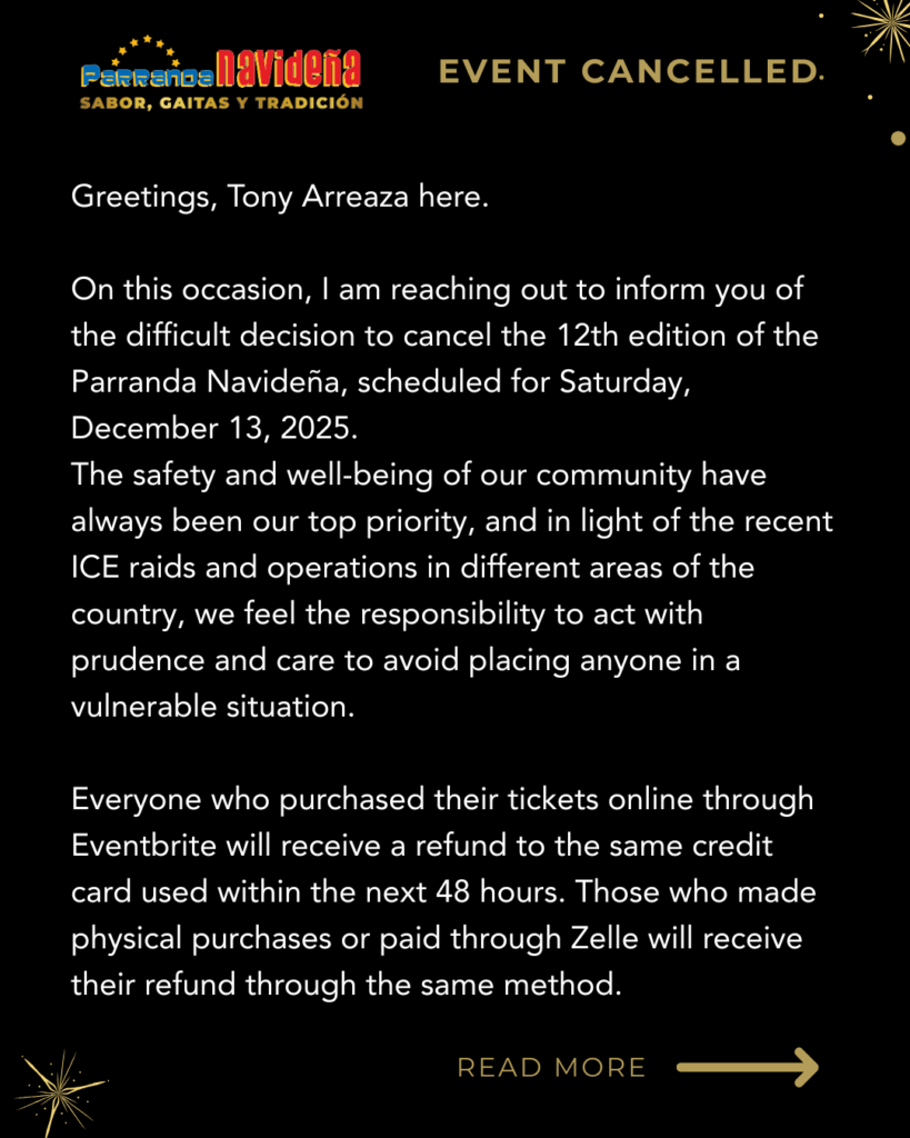 Con mucho pesar anunciamos la cancelación de la Parranda Navideña Venezolana 2025. La seguridad de nuestra comunidad es lo más importante.